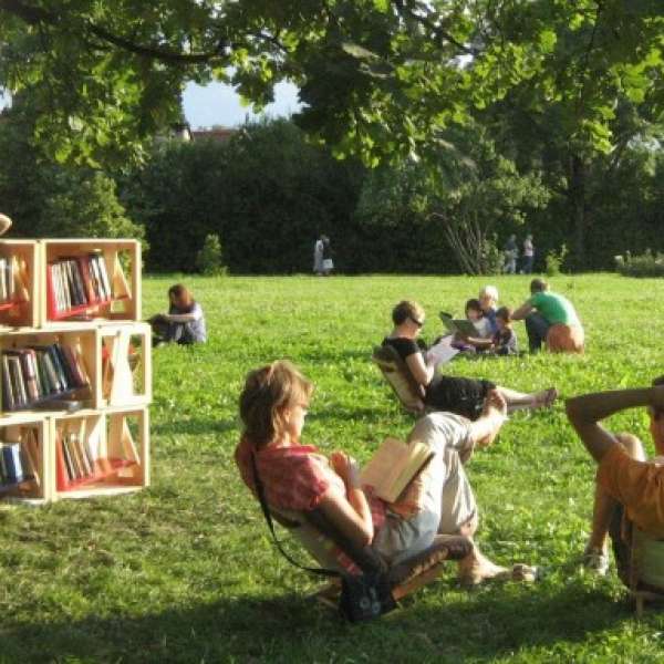 Knjižnica pod krošnjami – Library Under the treetops http://www.knjiznicapodkrosnjami.si/ Tina Popovic and a friend were waiting for a concert in line in a boring space. They noticed that when you are in a public space there is not that many thing to do.