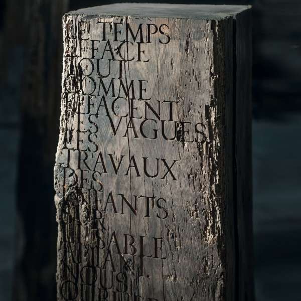 Jörg Bräuer, Monolith, 2019, wood, engraved lettering, 105 x 18,5 x 18 cm, quote from Marcel Proust, signed and dated