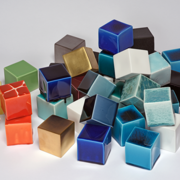 Colored cubes of every tone with alluring veins, drips and textures are on display in ceramic artist Emmanuel Boos’ glazed library